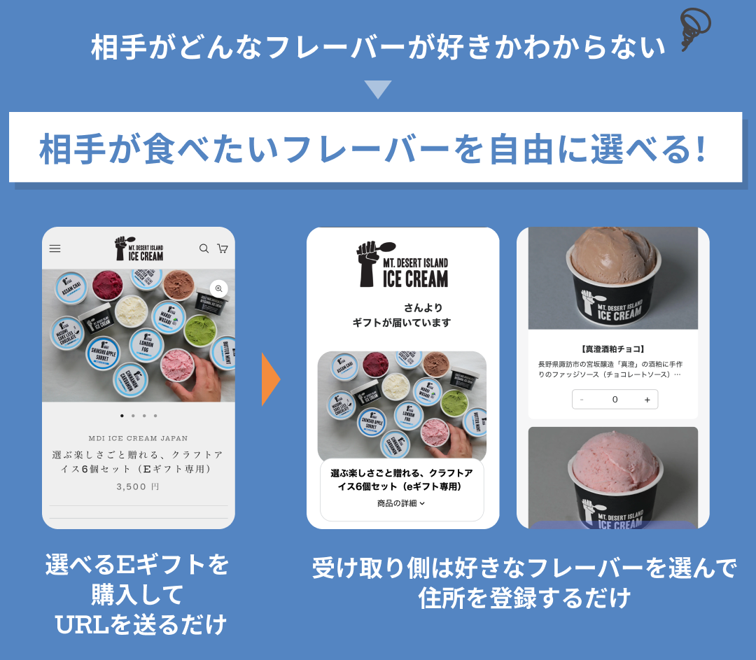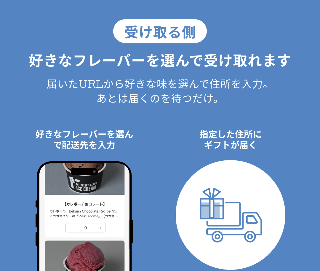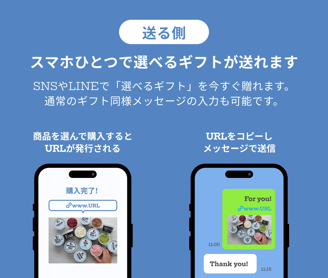 贈り手はギフトを購入し、専用ギフトページのURLを相手に送るだけ。カタログeギフトは受け取り手が、好きなフレーバーを自分で選べます!